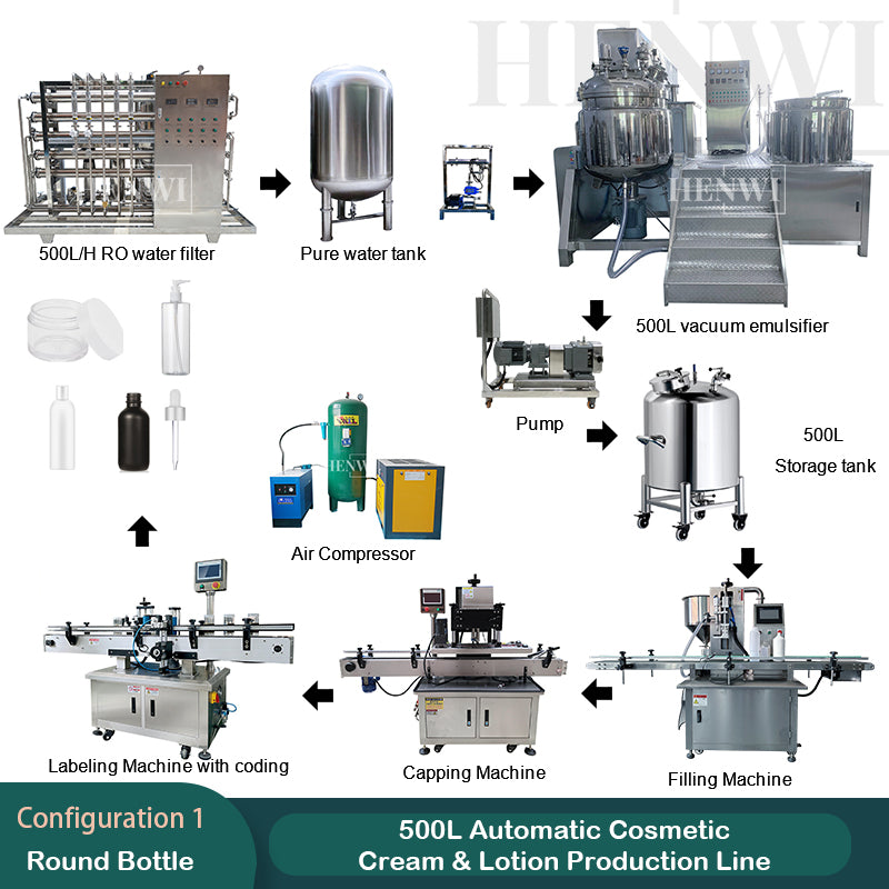 This 500L cosmetic cream production line is a complete set of production equipment system, designed for the manufacture of cream cosmetics (such as cream, lotion, cream, etc.). The production line ensures efficient, accurate and high-quality cosmetic cream production through the cooperation of various equipment, including reverse osmosis water treatment system, vacuum emulsification system, discharge pump, storage tank, filling machine, capping machine, labeling machine, tube packing machine, sachet packing machine and air compressor, etc.